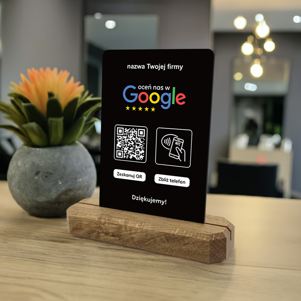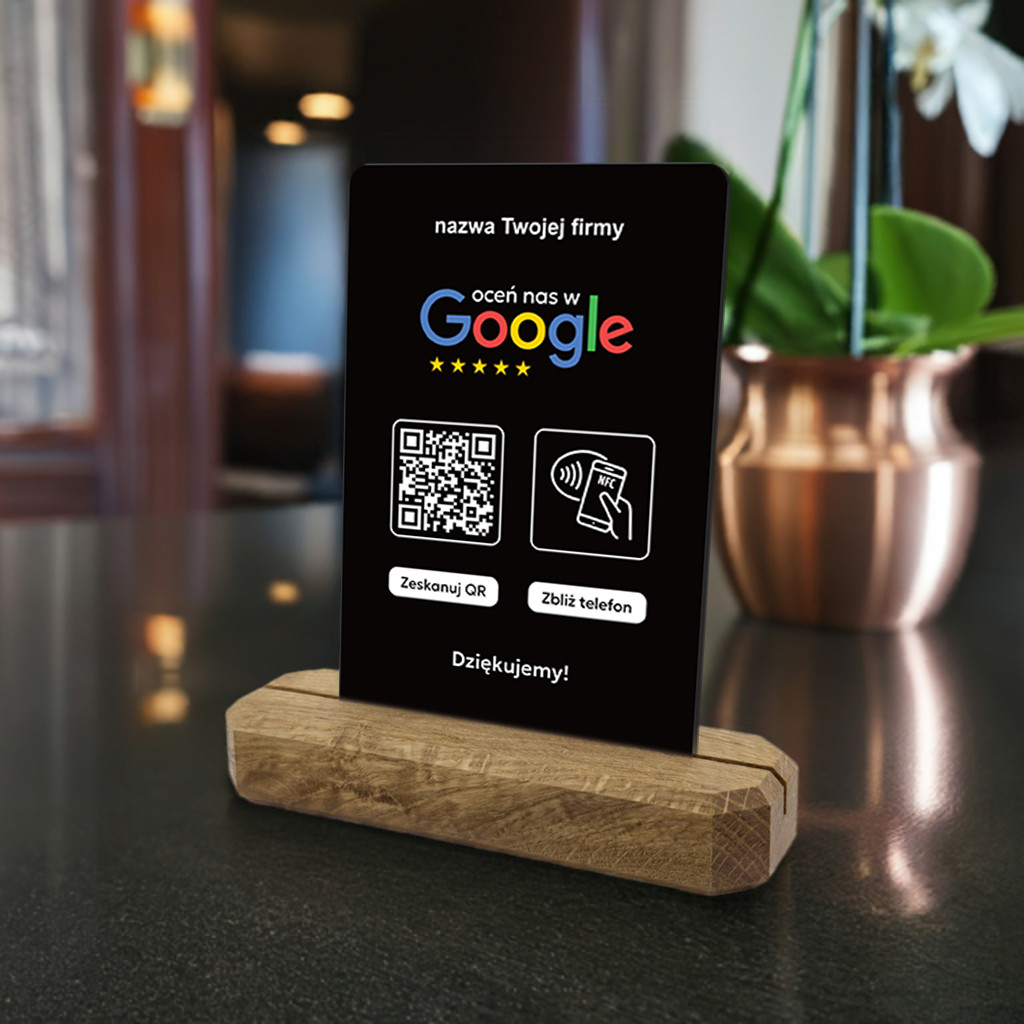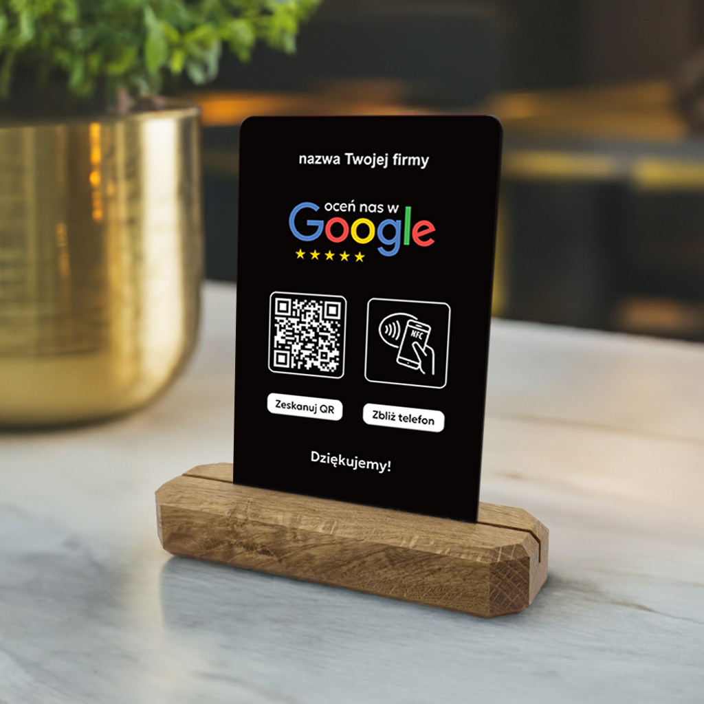 Karta z kodem QR i tagiem NFC na stojaku z litego drewna dębowego do zbierania opinii w Google jest idealnym rozwiązaniem dla Twojej firmy, produktu lub marki, której zależy na profesjonalnym podejściu do gromadzenia feedbacku i podnoszeniu swojej pozycji w wyszukiwarce. Zbieraj błyskawicznie opinie od swoich klientów, bez dodatkowych aplikacji - szybko, prosto i łatwo.