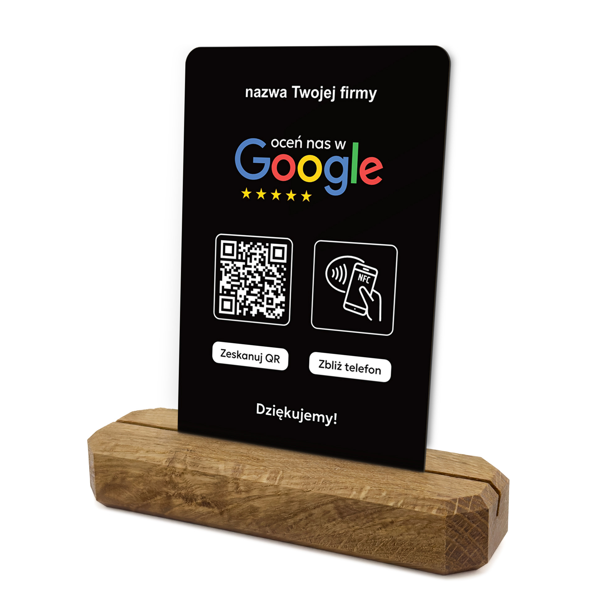 Stojak, prezenter z QR i NFC do zbierania opinii w Google, nazwa firmy, podkład dębowy, czarny