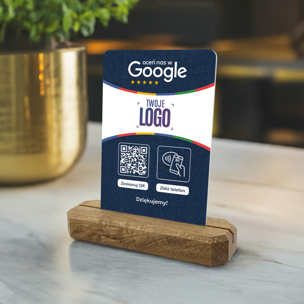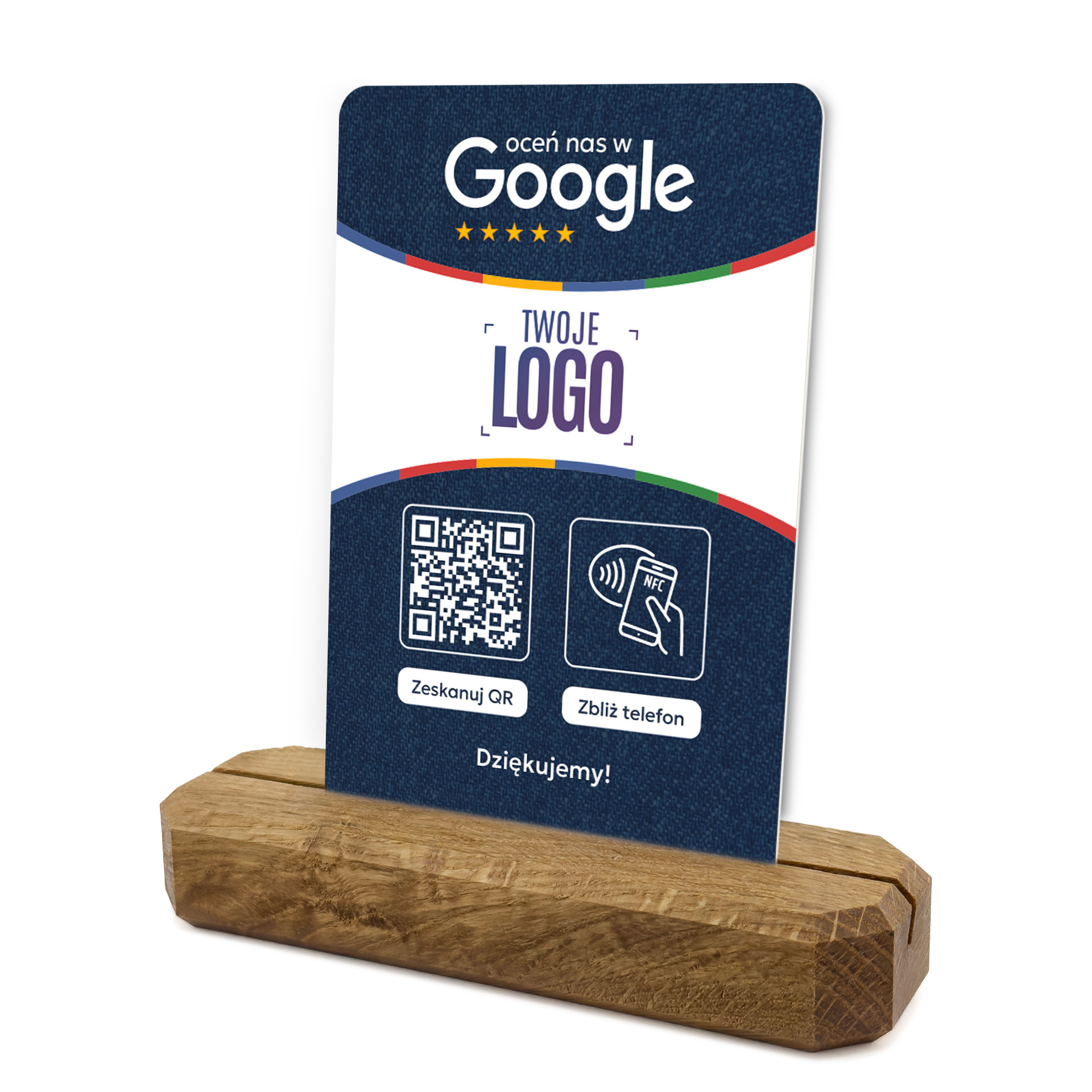Karta z kodem QR, tagiem NFC i logo Twojej firmy na stojaku z litego drewna dębowego do zbierania opinii w Google jest idealnym rozwiązaniem dla Twojej firmy, produktu lub marki, której zależy na profesjonalnym podejściu do gromadzenia feedbacku i podnoszeniu swojej pozycji w wyszukiwarce. Zbieraj błyskawicznie opinie od swoich klientów, bez dodatkowych aplikacji - szybko, prosto i łatwo.