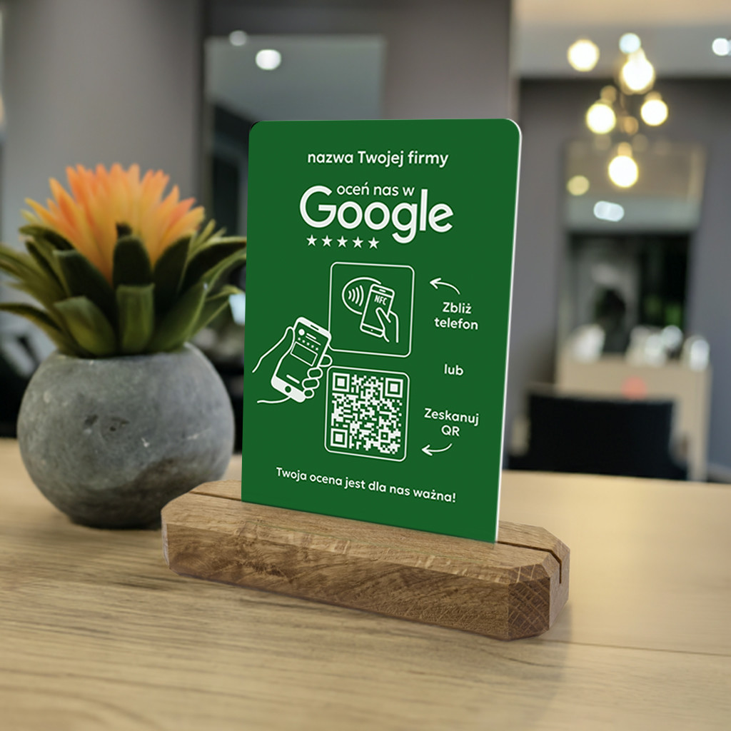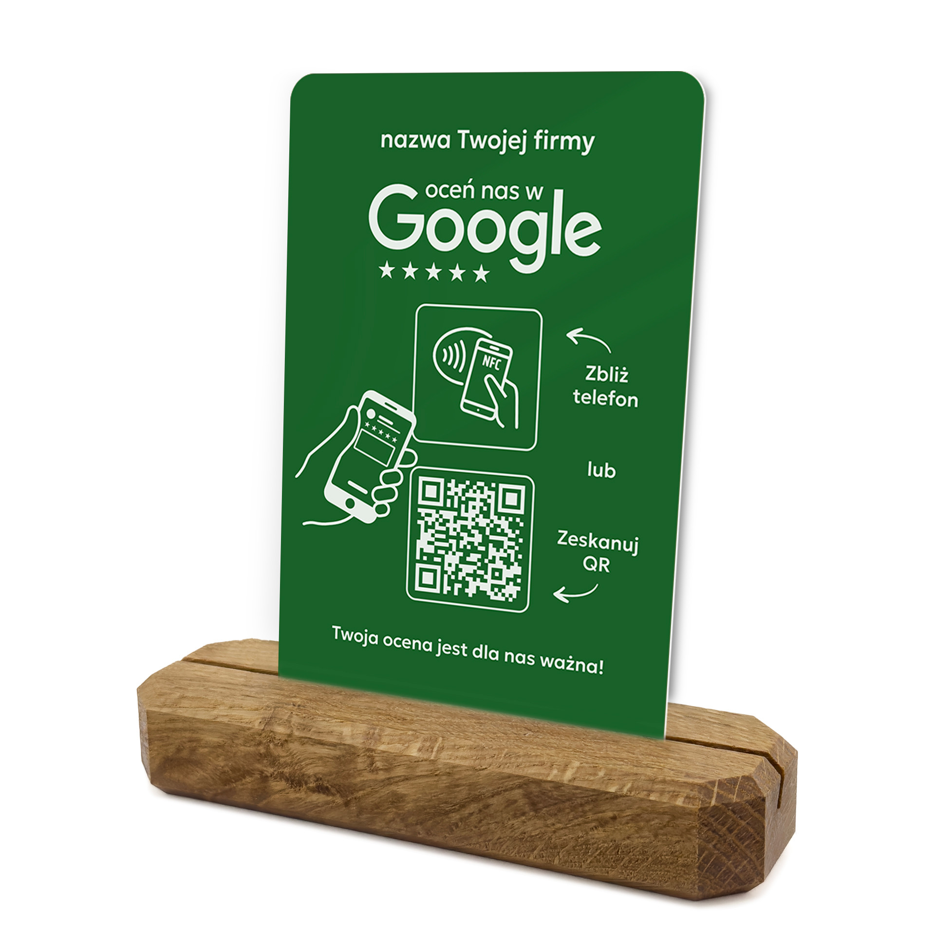 Karta z kodem QR i tagiem NFC na stojaku z litego drewna dębowego do zbierania opinii w Google jest idealnym rozwiązaniem dla Twojej firmy, produktu lub marki, której zależy na profesjonalnym podejściu do gromadzenia feedbacku i podnoszeniu swojej pozycji w wyszukiwarce. Zbieraj błyskawicznie opinie od swoich klientów, bez dodatkowych aplikacji - szybko, prosto i łatwo.
