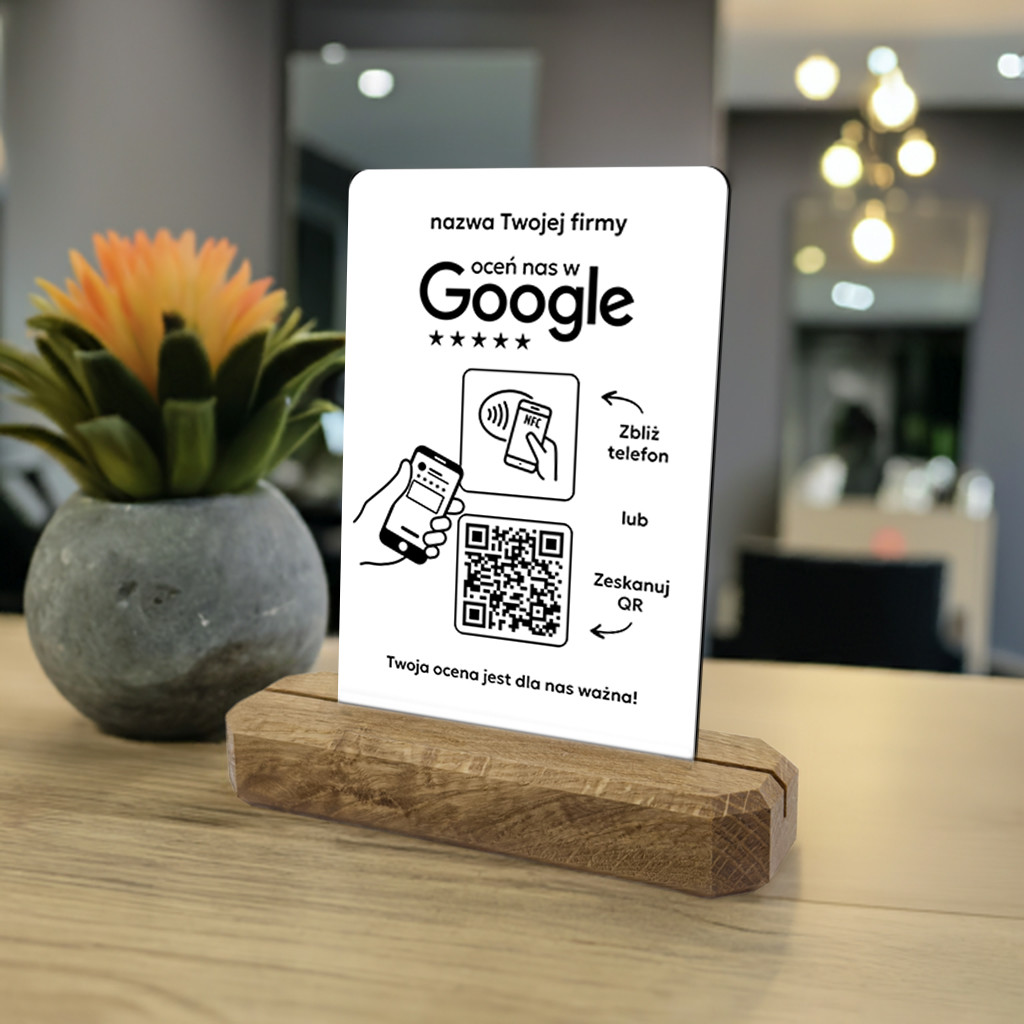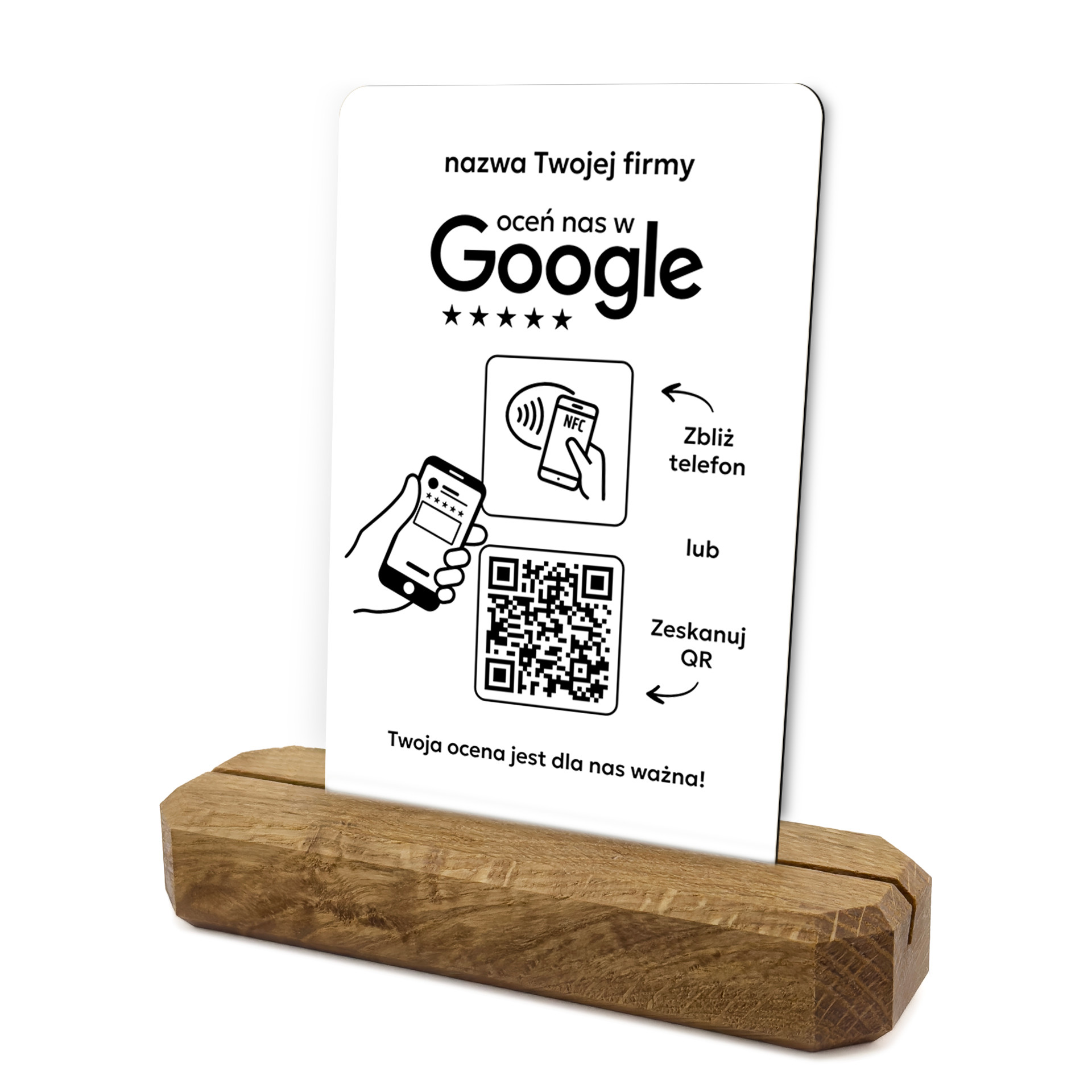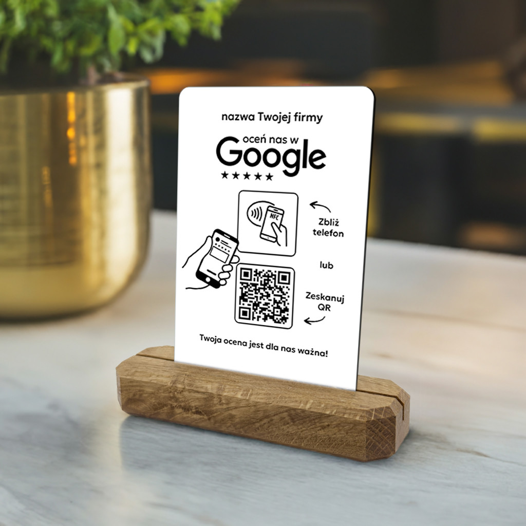 Karta z kodem QR i tagiem NFC na stojaku z litego drewna dębowego do zbierania opinii w Google jest idealnym rozwiązaniem dla Twojej firmy, produktu lub marki, której zależy na profesjonalnym podejściu do gromadzenia feedbacku i podnoszeniu swojej pozycji w wyszukiwarce. Zbieraj błyskawicznie opinie od swoich klientów, bez dodatkowych aplikacji - szybko, prosto i łatwo.