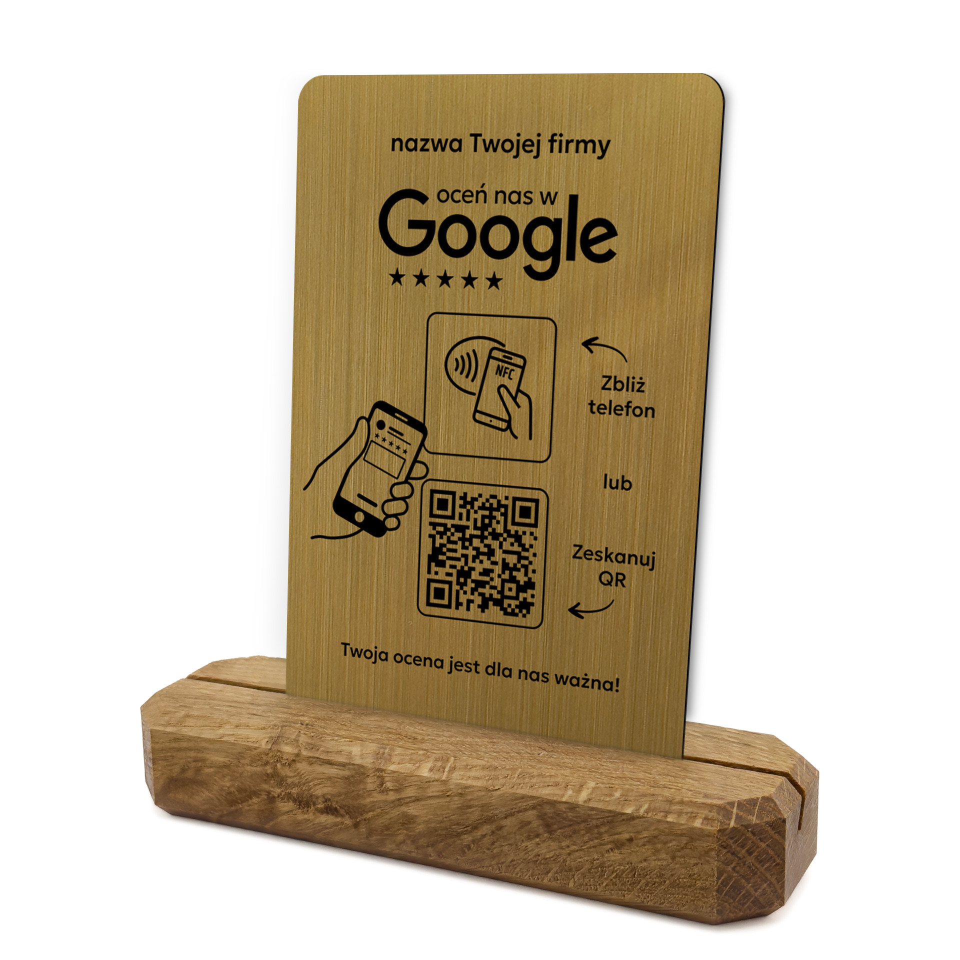 Stojak, prezenter z QR i NFC do zbierania opinii w Google, nazwa firmy, podkład dębowy, złoty klasyczny