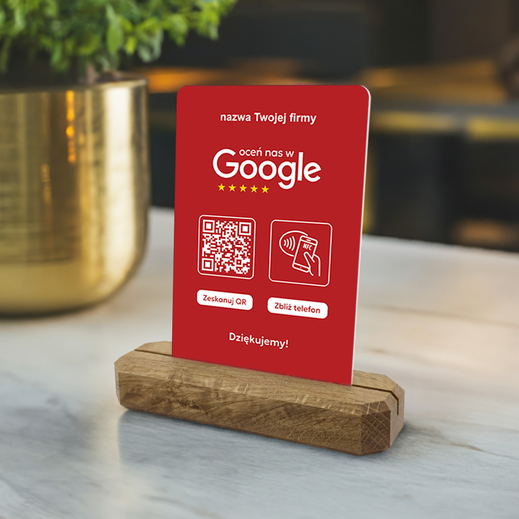 Karta z kodem QR i tagiem NFC na stojaku z litego drewna dębowego do zbierania opinii w Google jest idealnym rozwiązaniem dla Twojej firmy, produktu lub marki, której zależy na profesjonalnym podejściu do gromadzenia feedbacku i podnoszeniu swojej pozycji w wyszukiwarce. Zbieraj błyskawicznie opinie od swoich klientów, bez dodatkowych aplikacji - szybko, prosto i łatwo.