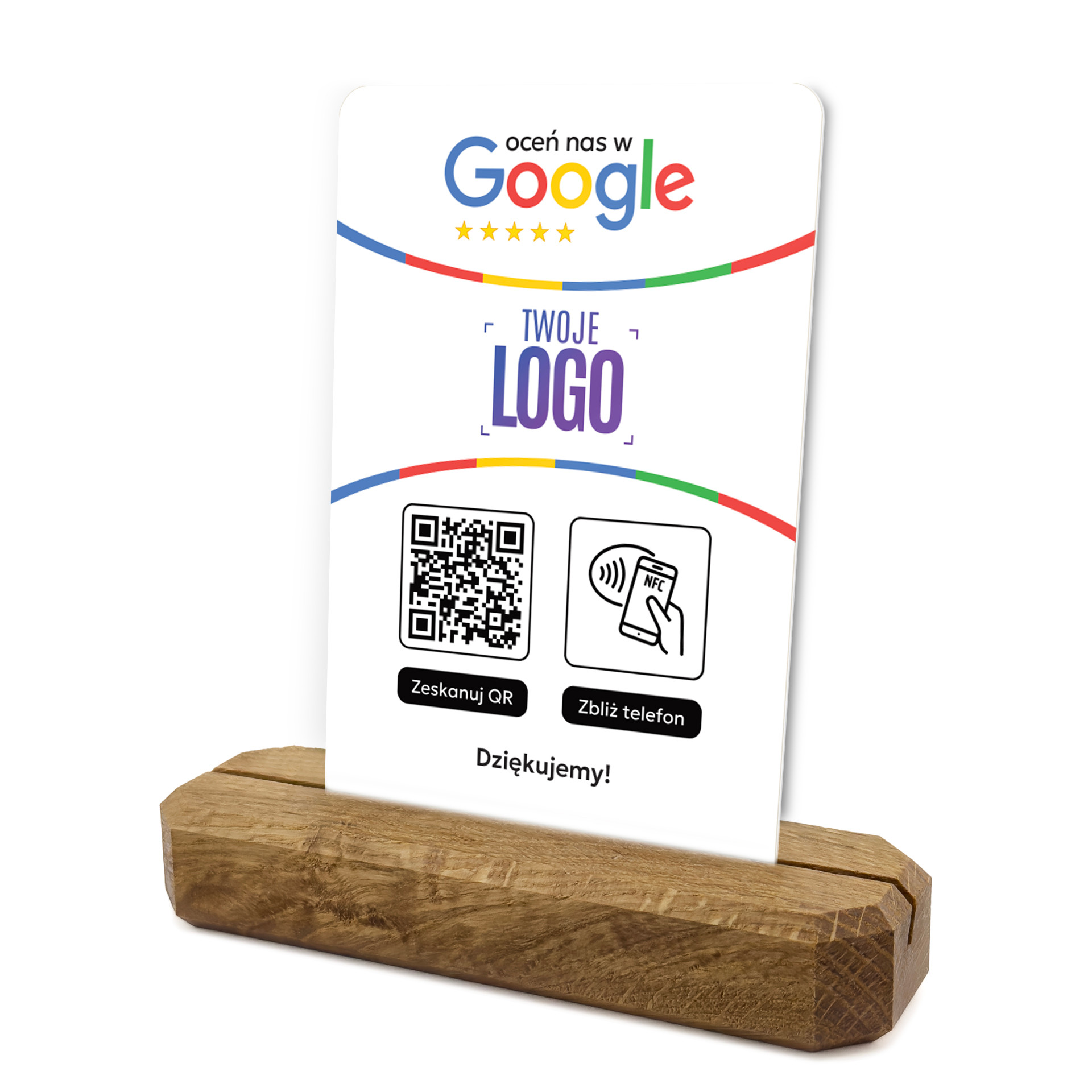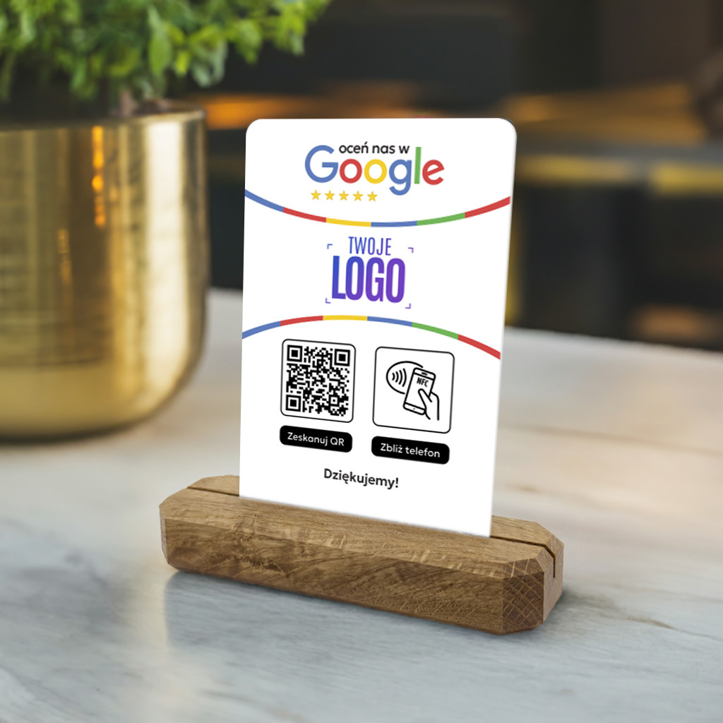 Karta z kodem QR, tagiem NFC i logo Twojej firmy na stojaku z litego drewna dębowego do zbierania opinii w Google jest idealnym rozwiązaniem dla Twojej firmy, produktu lub marki, której zależy na profesjonalnym podejściu do gromadzenia feedbacku i podnoszeniu swojej pozycji w wyszukiwarce. Zbieraj błyskawicznie opinie od swoich klientów, bez dodatkowych aplikacji - szybko, prosto i łatwo.