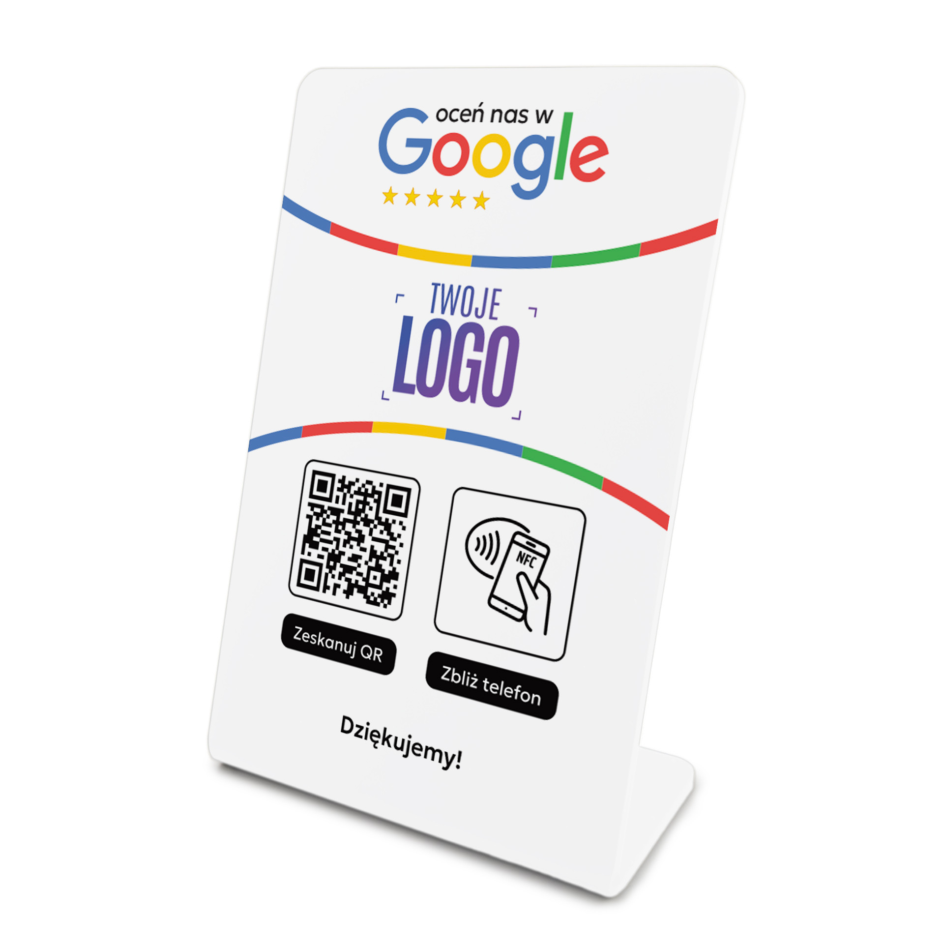 Stojak, prezenter gięty z kodem QR, tagiem NFC i logo Twojej firmy do zbierania opinii w Google jest idealnym rozwiązaniem dla Twojej firmy, produktu lub marki, której zależy na profesjonalnym podejściu do gromadzenia feedbacku i podnoszeniu swojej pozycji w wyszukiwarce. Zbieraj błyskawicznie opinie od swoich klientów, bez dodatkowych aplikacji - szybko, prosto i łatwo.