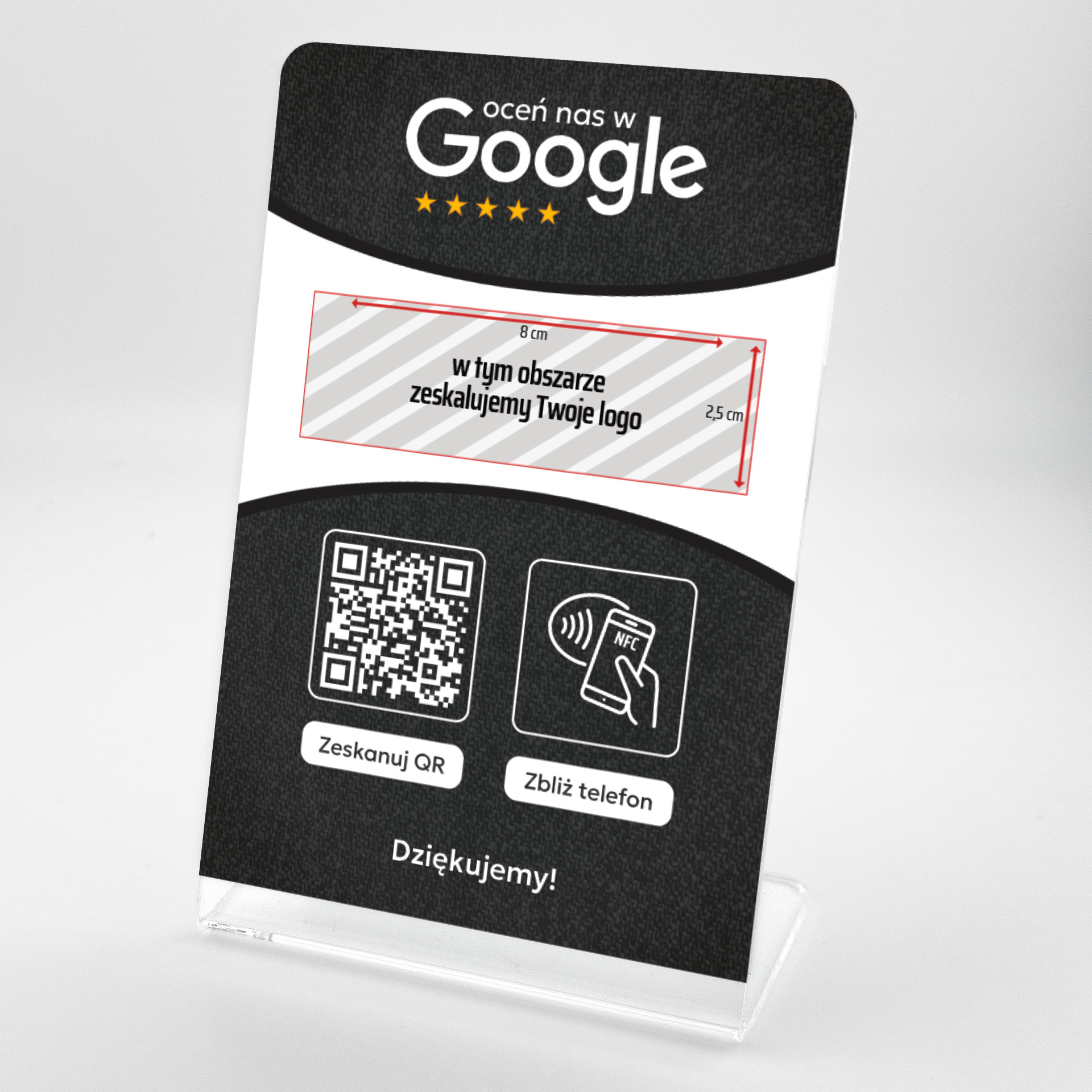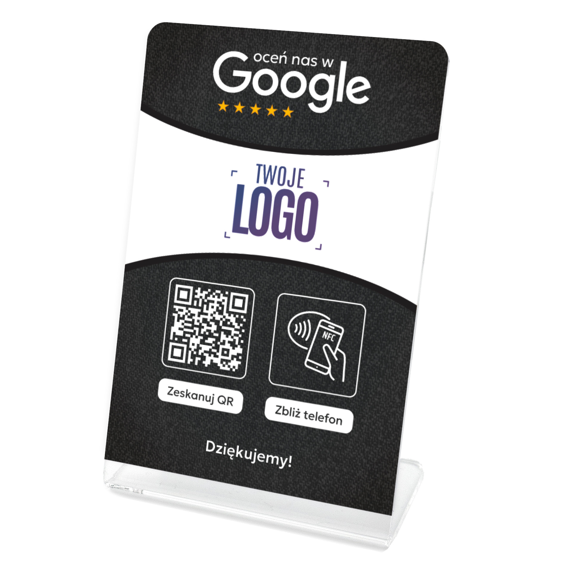 Stojak, prezenter gięty z QR, NFC i logo firmy do zbierania opinii w Google, ciemnoszary