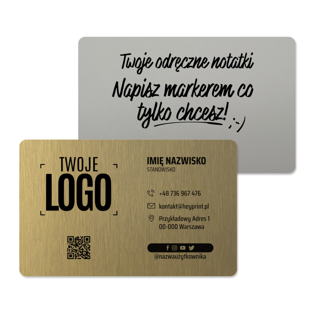 Ekskluzywne karty metalowe stworzone są ze specjalnego stopu aluminium o grubości 0.5 mm, co sprawia, że karty są twarde i wytrzymałe. Nadruk na nich wykonywany jest jednostronnie, natomiast druga strona - powleczona specjalnym materiałem - pozwala na wykonanie np. ręcznej notatki, a także ułatwia przyklejenie jej do dowolnej powierzchni.