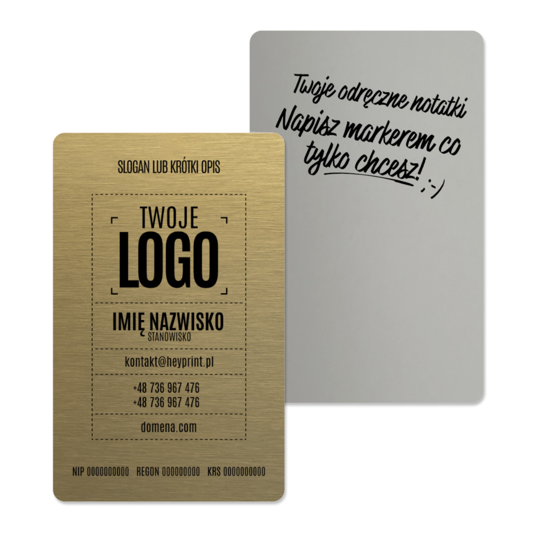 Ekskluzywne karty metalowe stworzone są ze specjalnego stopu aluminium o grubości 0.5 mm, co sprawia, że karty są twarde i wytrzymałe. Nadruk na nich wykonywany jest jednostronnie, natomiast druga strona - powleczona specjalnym materiałem - pozwala na wykonanie np. ręcznej notatki, a także ułatwia przyklejenie jej do dowolnej powierzchni.
