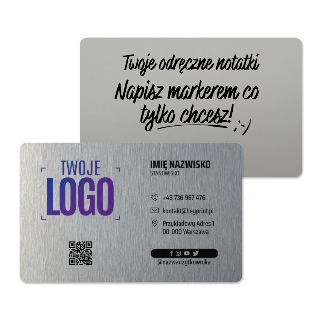 Ekskluzywne karty metalowe stworzone są ze specjalnego stopu aluminium o grubości 0.5 mm, co sprawia, że karty są twarde i wytrzymałe. Nadruk na nich wykonywany jest jednostronnie, natomiast druga strona - powleczona specjalnym materiałem - pozwala na wykonanie np. ręcznej notatki, a także ułatwia przyklejenie jej do dowolnej powierzchni.