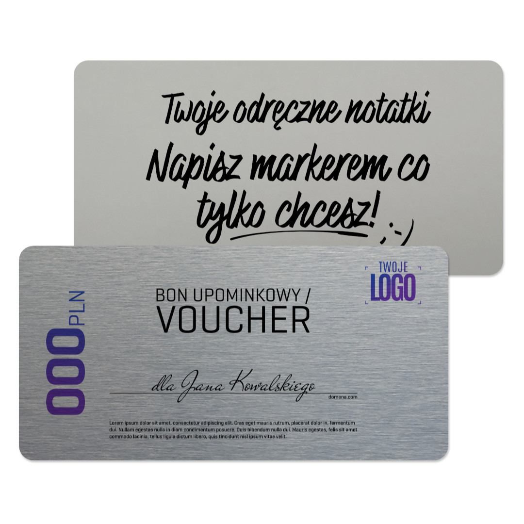 Metalowy bon podarunkowy wykonany ze stopu aluminium z Twoim własnym nadrukiem, to idealny sposób na promocję Twojego biznesu. Nieważne, czy prowadzisz sklep stacjonarny, internetowy, restaurację, salon, siłownię, czy działasz w dowolnej innej branży – taka forma zwiększenia sprzedaży Twoich produktów i usług jest zawsze skuteczna, zwiększając przy tym grono Twoich stałych klientów.