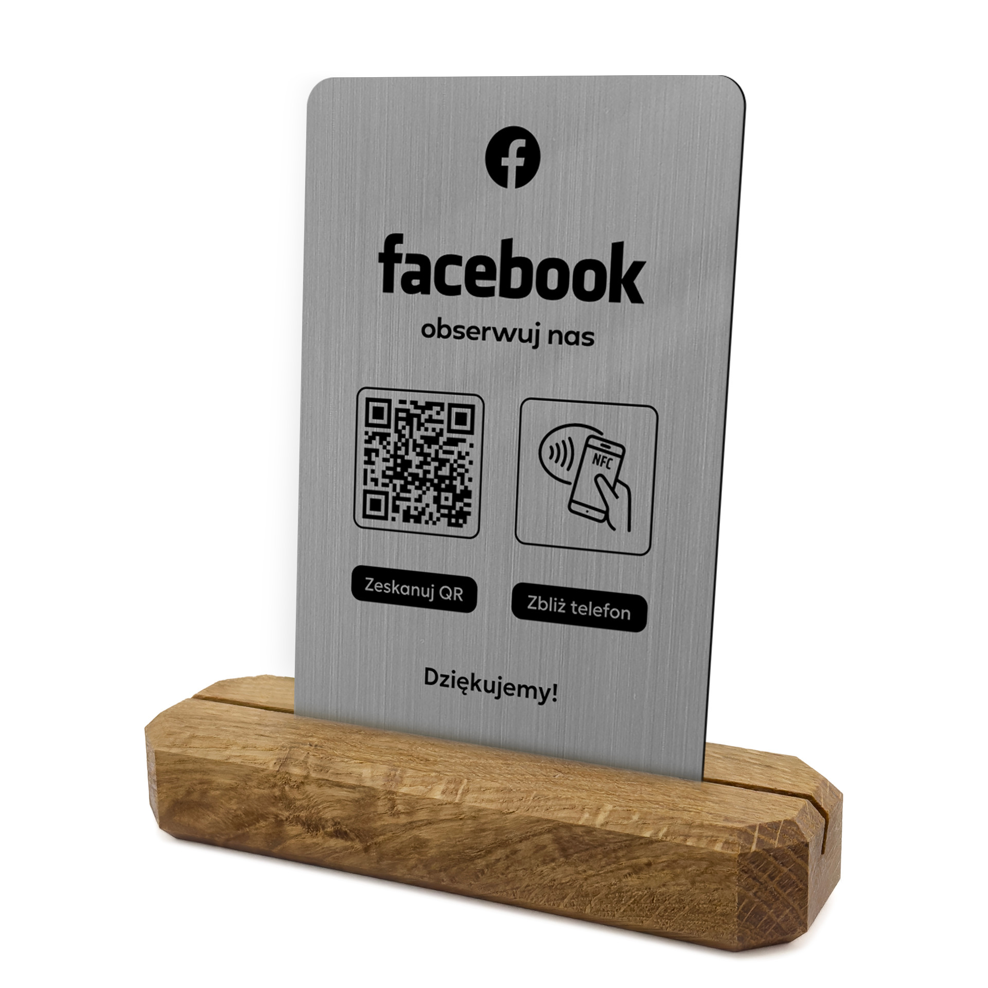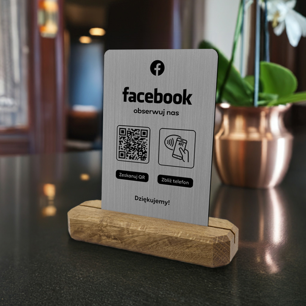 Stojak, karta z QR i NFC do pozyskiwania obserwujących Facebook, podkład dębowy, srebrna