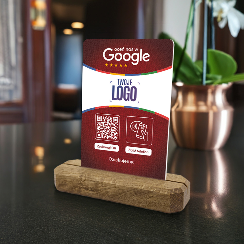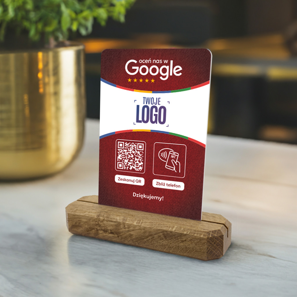 Karta z kodem QR, tagiem NFC i logo Twojej firmy na stojaku z litego drewna dębowego do zbierania opinii w Google jest idealnym rozwiązaniem dla Twojej firmy, produktu lub marki, której zależy na profesjonalnym podejściu do gromadzenia feedbacku i podnoszeniu swojej pozycji w wyszukiwarce. Zbieraj błyskawicznie opinie od swoich klientów, bez dodatkowych aplikacji - szybko, prosto i łatwo.